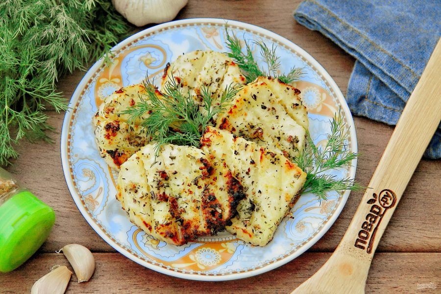 Соедините соль, специи, измельченный чеснок и растительное масло, перемешайте. Нарежьте сыр и обваляйте со всех сторонок в полученной смеси. Жарьте на сковороде или гриле до румяной корочки.