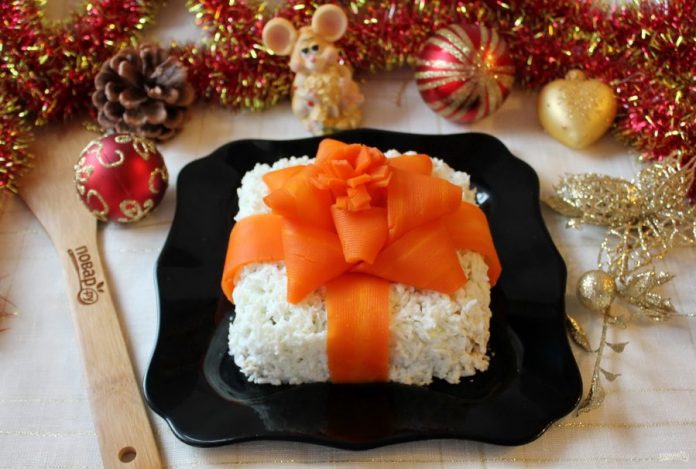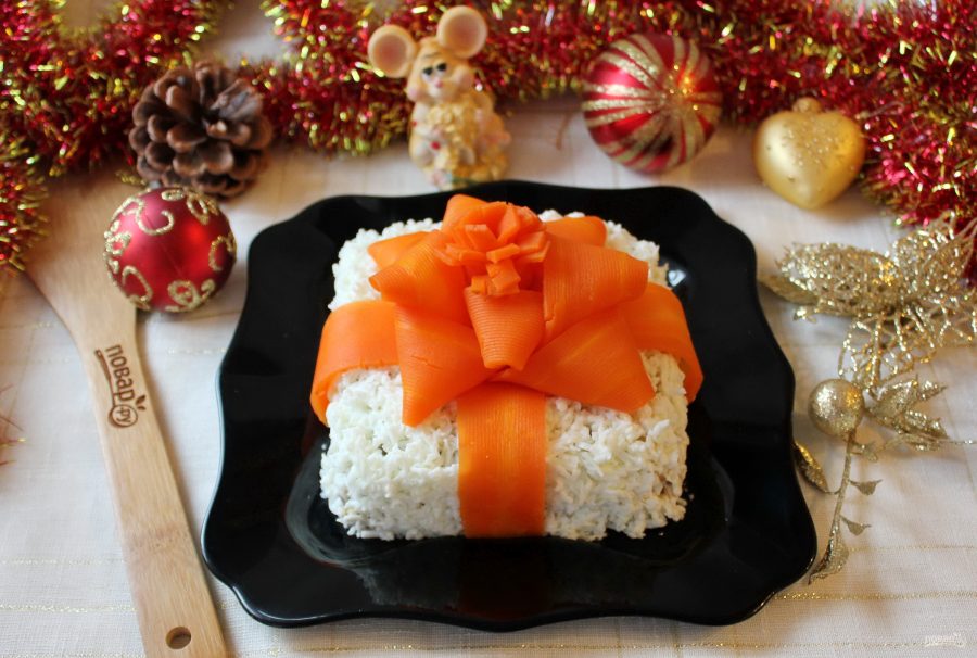 В состав салата входит свежий огурец, курица, яйца, вареный рис, лучок, сыр. Весьма сытный! После танцев и под крепкие напитки улетит мгновенно! Снежинки из моркови лучше всего вырезать при поддержки плунжера. Кстати, прекрасный подарок себе или подруге. Здесь ищите рецепт.