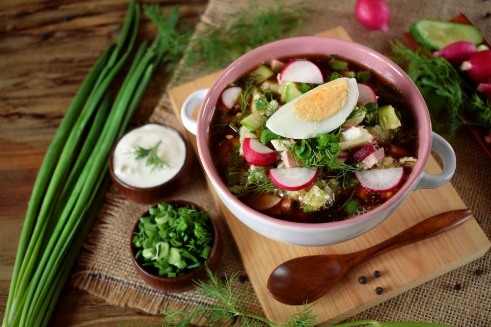 Самым популярным первым блюдом в горячее время года является окрошка – но мало кто пробовал готовить ее на квасе. А зря: получается сытное и пикантное блюдо с легким привкусом кваса. Стряпать ее проще простого – достаточно смешать все классические ингредиенты, а часть сметаны заменить квасом.