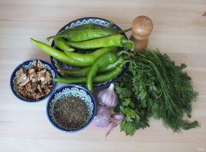 Перец, зелень помойте и просушите. Почистите чеснок. Орехи подсушите на сковороде, не зажаривайте.