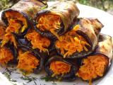 Для приготовления начинки морковь очистить и натереть на крупной терке. Выложить на сковороду с разогретым маслом и обжарить до мягкости. В теплую пассерованную морковь добавить очищенный и пропущенный сквозь пресс чеснок и натертый на терке сыр. Готовую начинку перемешать, выложить на пластинки баклажана и свернуть их в рулетики.