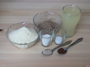Если вы обладатель хлебопечки, то тесто можно замесить в ней. Закладка продуктов сообразно вашей инструкции. Выберите программу «Тесто», время 1 час 04 мин. Если техники нет, то замес сделайте следующим манером: в подогретую сыворотку добавьте соль, сахар, дрожжи. Отдельно смешайте льняную и кукурузную муку, 1 ч.л. льняного семени. Соедините обе доли и добавьте 1 ст.л. растительного масла.