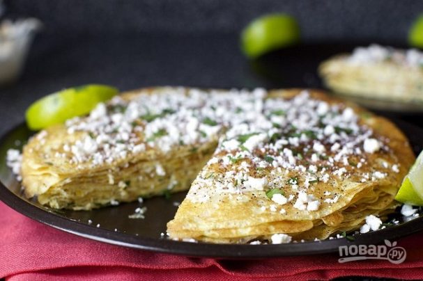 Если вы обожаете торты из блинчиков, то наверняка уже не раз экспериментировали с начинкой. В данном случае эксперимент не лишь с кремом, но и с самим тестом:) Кукурузные блины получаются весьма интересными и действительно вкусными. А вот что касается начинки, то тут вы можете дополнить сыр помидорками, так, или сальсой. Такой вариант попробовать точно нужно:)