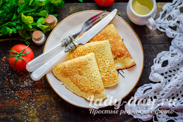Разогреть неплохо блинную сковороду, смазать тонким слоем масла. Влить в сковороду немного теста, жарить блины с обеих сторонок по полминуты. Спустя время все блины уложить на тарелку и подавать к столу.