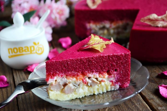 Ослепительный сногсшибательный чизкейк на самом деле является не чем иным, как традиционной селёдкой под шубой! Отвариваем овощи, чистим селёдку, нарезаем, выкладываем в разъёмную конфигурацию слоями – ничего необычного. Волшебство сотворит свёкла. Варёную свёклу взобьем в блендере с плавленым сыром. Добавим желатин и зальём на салат в конфигурации. Обязательно приготовьте на ближайший праздник!