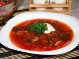 Продукты: свекла молодая с ботвой 5 шт., картофель 2 шт., фасоль 1/4 стакана, морковь, корень петрушки по 1 шт., репчатый лук 2 головки, кабачки 200 г, свежие помидоры 2 шт., растительное масло, 3%-й уксус по 1 ст. ложке, вода 2,5 л, соль, специи, сахарный песок, зелень.
