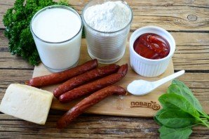 В готовое тесто добавьте половину порезанных копченых колбасок, натертый на тонкой терке сыр и половину томатного соуса.