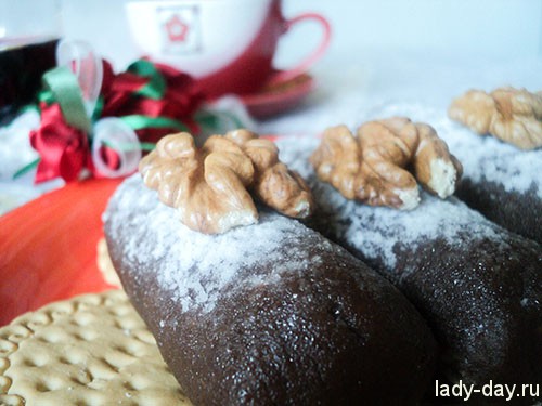 Готовые домашние пирожные присыпаем сахарной пудрой, украшаем орехами.