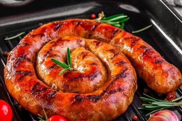 Завязать один крышка оболочки для колбасы узлом, заполнить фаршем, не доходя 5 сантиметров до кромки, плотно завязать, повторить все для остальных колбас, полчаса дать постоять.