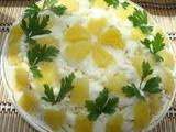 Возьмите большенное и не очень глубокое блюдо, зеленый горошек, кукурузу, фасоль уложите слоями товарищ на друга произвольно, между двумя слоями поместите ювелирный слой из натертого на терке корня сельдерея, самый верхний слой из бобовых изобильно смажьте майонезом. Закончить композицию блюда можно неглубоко нарезанными ананасами — просто, быстро и очень вкусно! А можно пофантазировать и украсить салат кукурузой в облике початка или выложить цветы из ананасов – все наволю вашей фантазии!