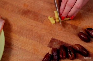 1. Для основы очистите финики от косточек. Сыр нарежьте крупными кусочками и нафаршируйте им очищенные финики.