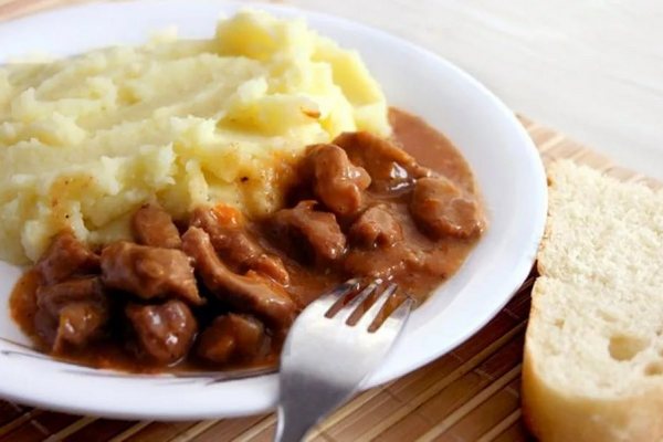 Смешать чайную ложку томатной пасты, столовую мучения с теплой водой (0,5 стакана), добавить столовую ложку сметаны, неплохо все перемешать, чтобы разбить все комочки. Вылить тонкой струйкой в мясо, всегда помешивая, тушить еще 10 минут все вместе. Сварить картофель, размять до состояния пюре, влить подогретое подсоленное молоко, перемешать. Подавать гуляш из мяса с пюре и подливой в горячем виде.