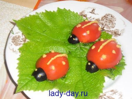 Выложить заполненные салатом половинки на тарелку и сделать из них божьи коровки с поддержкой разрезанной на четыре части маслины, которая будет воображать собой голову. Полоску и точечки поставить горчицей, для этого необходимо покупать горчицу в пакете, тогда рисование не вызовет никаких трудностей.
