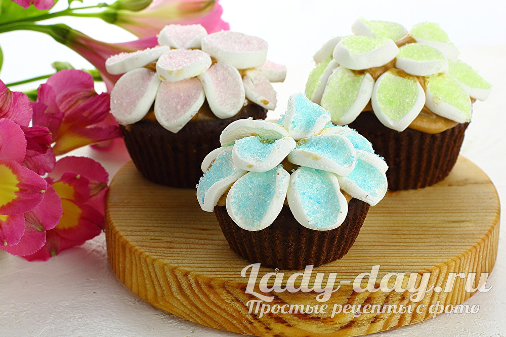 Маршмеллоу нарезать пластинками, окунуть с одной стороны в цветной сахар и сформировать цветочки.