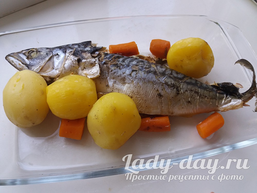 Картошку почистите, крупную перережьте напополам. Можно к рыбе также добавить крупно нарезанную морковку.
