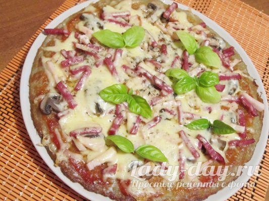 Начинкой для нее также остаются популярные ингредиенты: ветчина, колбаса, грибы, сыр и др. Одним словом, что найдете в холодильнике съедобного. Однако, основой этой пиццы является картофельная масса, какая распределяется в сковороде в виде пласта. И да, она немного отличается по вкусу от традиционной. Но рецепт не немного вкусный. Попробуйте!