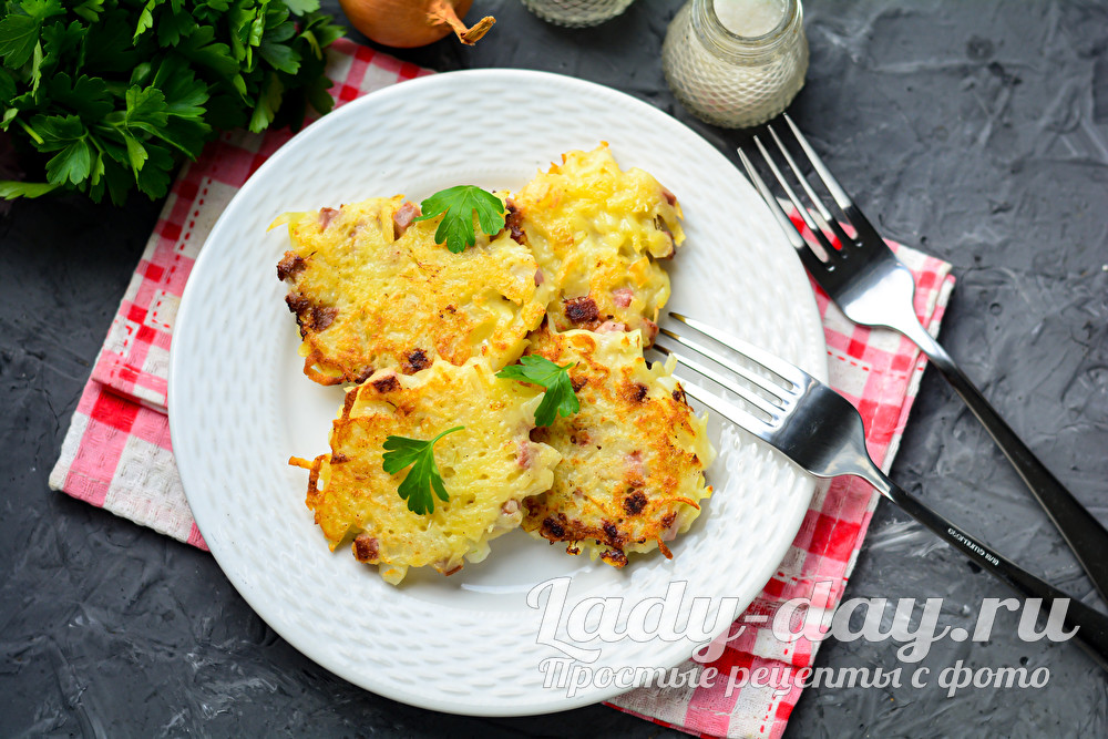 Сразу подавайте к столу. Вот такие картофельные оладьи получились, с колбасой – они сделаются еще вкуснее. Приятного вам аппетита!