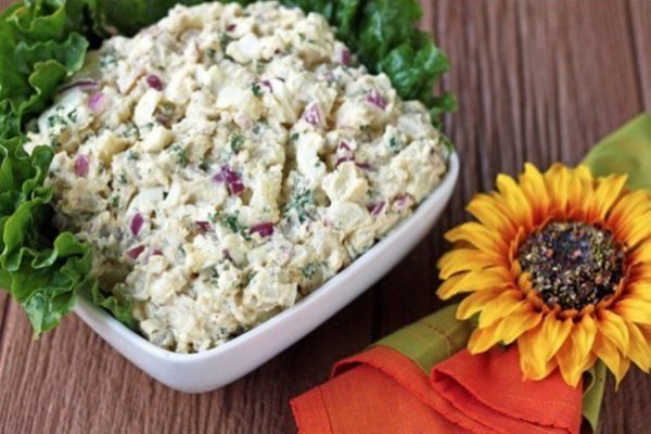 Заправить салат смешением майонеза и сметаны. Посыпать специями. Перемешать картофельный салат с алым луком и яйцами, отправить в холодильник.