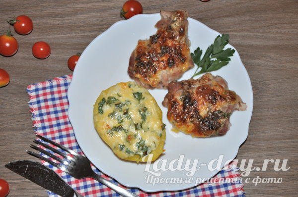 Когда мясо под соусом слегка подрумянится, положите к нему на противень подготовленные половинки картофеля и запекайте еще возле 10 — 15 минут, добавив температуру в духовке до 200 — 250 градусов, чтобы картофель и мясо полностью подрумянились, а сыр в соусе — растопился.