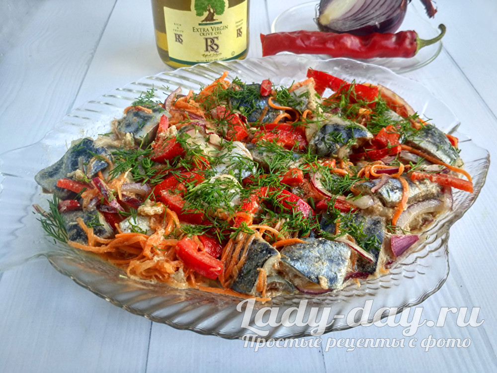 Всем охотникам хе предлагаю рецепт корейской закуски из скумбрии, которая приготовится за 1 час. Скорое маринование происходит за счет использования соевого соуса и небольшого размера кусочков рыбы, без шкурки. Добавленные сезонные овощи и муравы будут очень кстати. Они дадут свой аромат рыбке и сами могут использоваться как дополнение к ней. Сухие специи вы можете избрать по своему вкусу. Я использовала сушеный розмарин и кориандр. Можно избрать готовый набор специй для корейских блюд. Лучше итого подойдет оливковое или кукурузное масло.