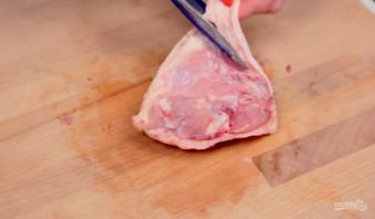 1. Для основы обмакните курицу бумажным полотенцем, чтобы убрать излишнюю влагу. Затем с помощью ножниц отделите косточки от мяса, оставляя шкурку цельной.