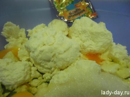 Добавьте к нему яйца, ванильный сахар и сахар-песок.