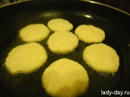 9. Когда сырники подрумянятся, чистоплотно переворачиваем их и обжариваем с другой стороны.