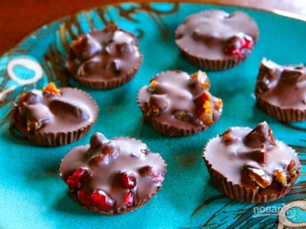 Не останавливайте свою фантазию на этом рецепте. Хватайте разные сухофрукты, ягоды, орехи и фрукты, чтобы разнообразить вкусы. Но для основы запишите себе, как приготовить конфеты из тёмного шоколада с гранатом, смоковницей и финиками. Десерт подходит для вегетарианского питания и будет уместен на любом празднике.