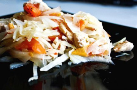 - Шаг 3 Курицу добавляем к капусте, перемешиваем, тушим ещё 2-3 минуты, перчим и подаем к столу.
