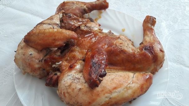 Выложите курицу в протока для запекания и готовьте при 180-200 градусов около 1 часа.