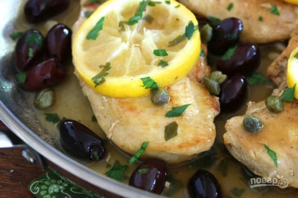 4. Выложите в соус кусочки мяса, выложите кругом оливки и каперсы. Нарежьте лимон кусочками и выложите на курицу.