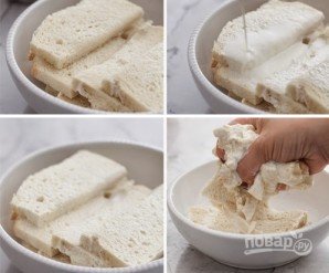 1. Первым делом замочите 4 ломтика хлеба в молоке или сливках. После того как они неплохо размокнут, отожмите лишнюю жидкость.
