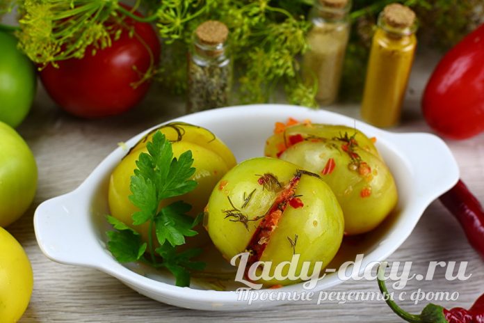 Осенью, самое время, заготавливать зеленые помидоры. Овощи можно приобрести на любом рынке и цена у них довольно привлекательная. Если вы любитель всяческих разносолов, тогда этот простой рецепт, непременно, придется вам по вкусу.