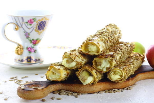 Начиненную трубочку окуните во вспушенные яйца, потом запанируйте в измельченных семечках.