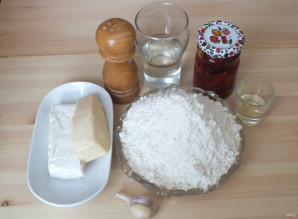 За это пора сделайте начинку, натрите сыр на крупной терке, перемешайте с творогом, вялеными помидорами и измельченным чесноком. Если необходимо, то подсолите. Перемешайте. Всеобщий вес начинки должен получиться 200 грамм.
