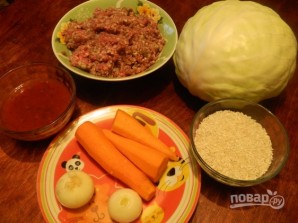 Форму или сковороду смазываем растительным маслом и выкладываем капустные листья. Затем выложим половину начинки из риса с фаршем.
