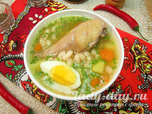 Готовый суп с курицей и фасолью отставить с пламени. Куриные яйца (2 штуки) отварить, измельчить и добавить в кастрюлю, а можно сделать иначе — положить по половинке яйца в любую порцию. Теперь осталось посыпать зеленым луком и можно приглашать к столу. Приятного аппетита!