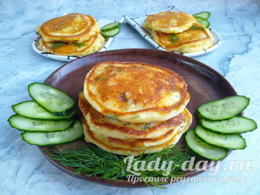Для начинки потребуется твердый сыр с жирностью – 45 %. Для рецепта подойдут ароматные грузинские травы в сушеном или свежем виде. Количество чеснока варьируйте по своему вкусу. Оладьи придутся для сытного завтрака или на перекус.