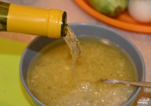 Для того чтобы приготовить овощи на мангале сочными и пряными, нам необходим маринад. Для его приготовления я использую оливковое масло, репчатый лук, соль и специи. Репчатый лук можно потереть на крупной терке или попросту мелко порубить. Чеснок также будет хорош в маринаде. Лук и чеснок могут быть и в сушеном облике. Подойдут специи для овощей и вообще все те, которые любите собственно вы. Смешиваем лук, специи и соль с оливковым маслом.