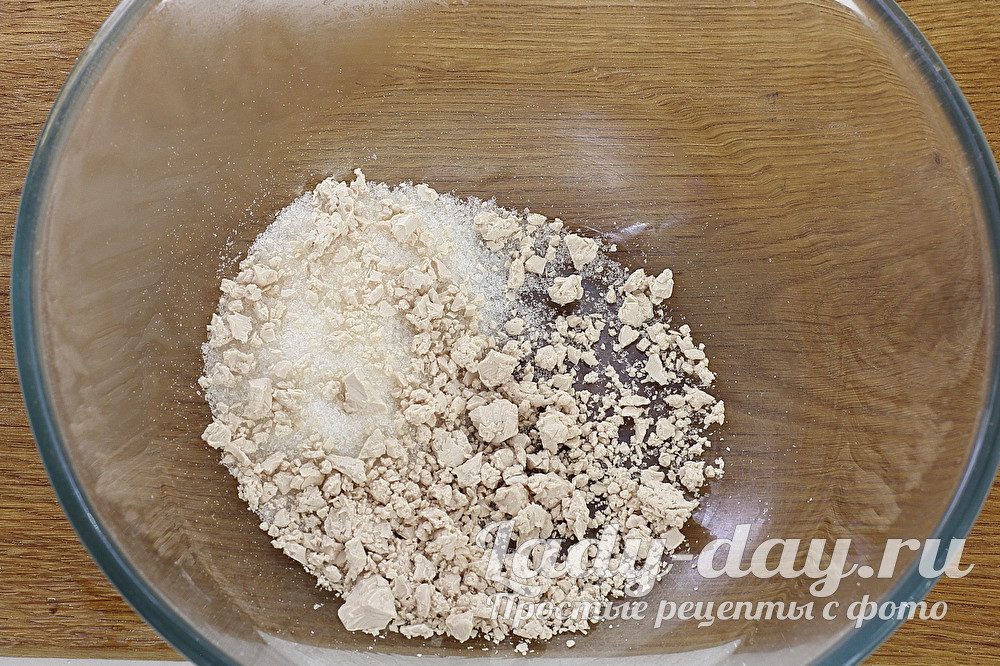 Первым делом, необходимо завести дрожжи. Приготовим опару. Отсыпьте пару столовых ложек сахара в глубокую емкость для замеса теста. Раскрошите дрожжи дланями.