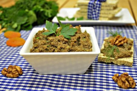 Несмотря на такие, представлялось бы, несовместимые продукты, паштет получается необычайно вкусным. А махонькие кусочки жареного лука придают паштету своеобразную пикантную нотку. Такое блюдо особенно живо во время поста. Чечевица относится к чрезвычайно полезным диетическим продуктам и выделяется повышенным содержанием растительных белков, грецкий орех также состоятелен полноценными растительными белками и спасает при весеннем авитаминозе, прок кураги для здоровья человека неоценима, это крайне нужный и здоровейший продукт, полностью отвечающий требованиям здорового питания.Ингредиенты