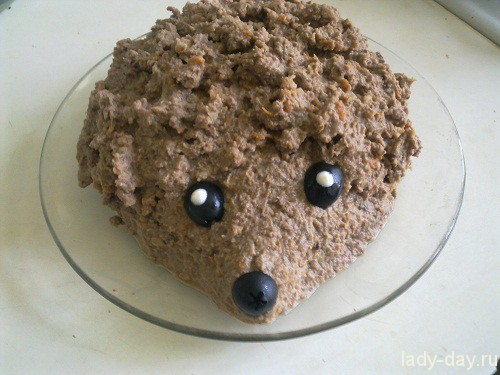 Поперчить, перемешать, выложить на тарелочку и украсить. Одну маслинку разрезать напополам и положить на паштет из куриной печени. Капнуть на них по капельке майонеза, это будут глазки «ежика». От другой отрезать кусочек – носик.