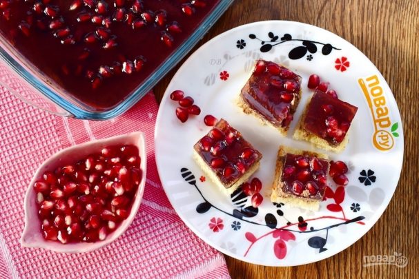 Кислинка гранатового желе легко подчеркивает вкус изнеженного паштета из куриной печени. Закуска не только получается лакомой, но и эффектно сморится при подаче. Ее можно подать с ломтиками белоснежного хлеба.