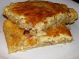 Готовим начинку. Мелко нарезанный лук обдаем кипятком, промываем его в морозной воде и поджариваем на сковороде, чтобы он стал прозрачным. Даем простынуть, перекладываем в глубокую миску. Добавляем 3 яйца (немного желтка оставляем на смазку верхнего коржа) и натертые на терке плавленые сырки. Все тщательно перемешиваем.