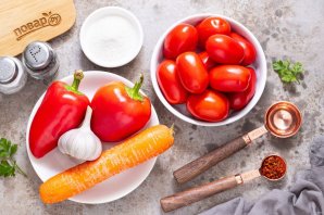 Ниже я расскажу подробнее, как приготовить помидоры в овощной заливке. Помидоры выбирайте небольшого размера, плотные и мясистые. Неплохо подойдет сорт сливка. По желанию в заливку можно добавить мелко нарезанную зелень: петрушку, кинзу или укроп. Помидоры получаются пикантными, чуть остренькими и весьма ароматными. Такая закуска отлично разнообразит повседневное меню в зимнее время года, так что берите на заметку!