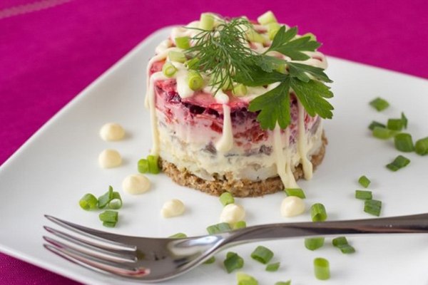 Дальше – слой моркови, также нарезанной кубиками, майонез, кубики свеклы, майонез. Конфигурацию снять, бока получившейся башенки посыпать зеленым луком, украсить лосось под шубой веточками петрушки и укропа.