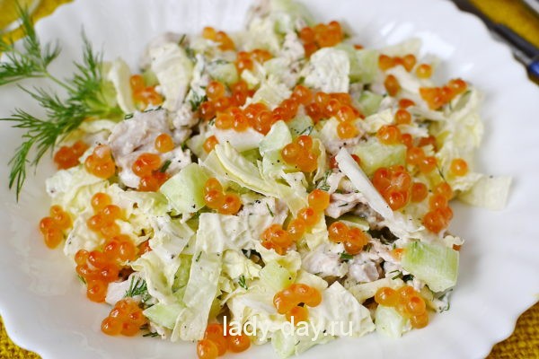 Пошаговый рецепт с фото салата с алой икрой, пекинской капустой и курицей: