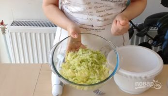 4. Муку заранее просеиваете и добавляете к основным продуктам, перемешайте. Добавляете измельченный ранее кабачок, перемешиваете содержимое миски.