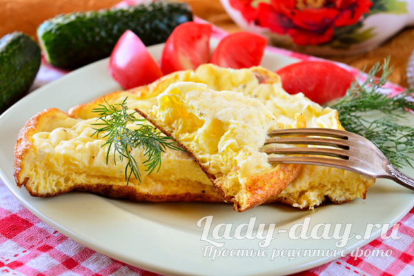 Сквозь пройденное время открываем крышку и омлет готов. Он пышный, лакомый и воздушный.