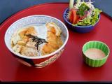 Продовольствие на 1 порцию: свинина -130 г, среднезернистый рис — 75 г,яйца -1 +1/2шт., панировочные сухари – 1 ст. ложка, мучение – 1 ч. ложка, куриный бульон — 50 мл, соус мирин — 1 ст. ложка,, соевый соус – 1 ст. ложка, масло для фритюра – 30 г, травяной лук (луковицы) – 10 г.